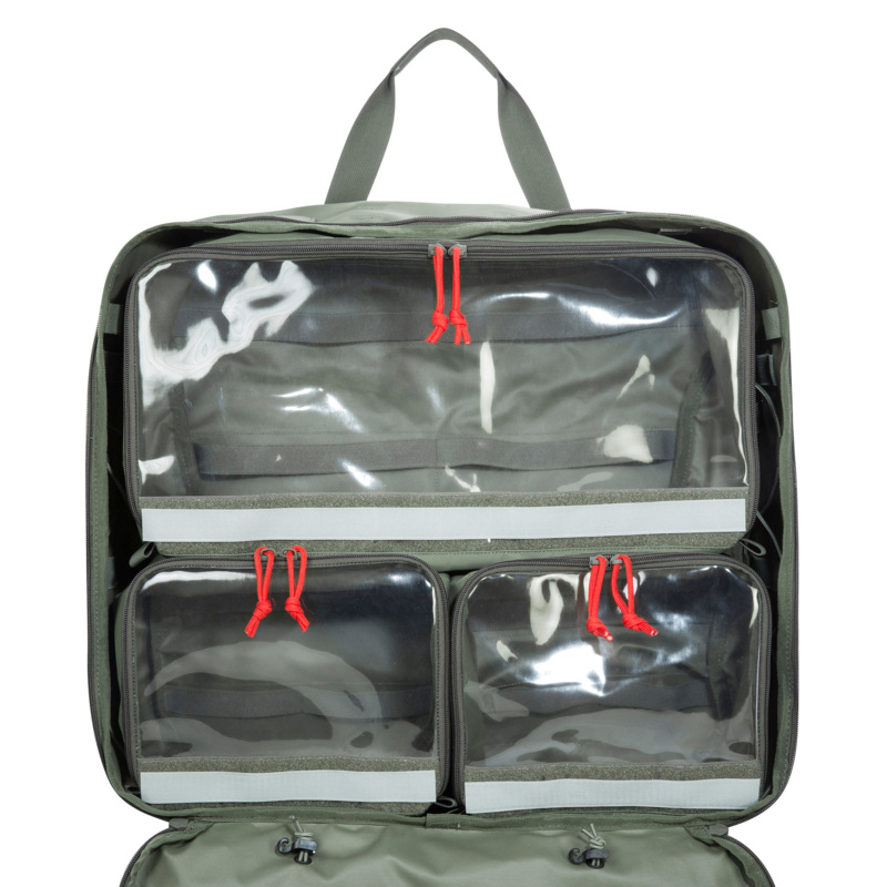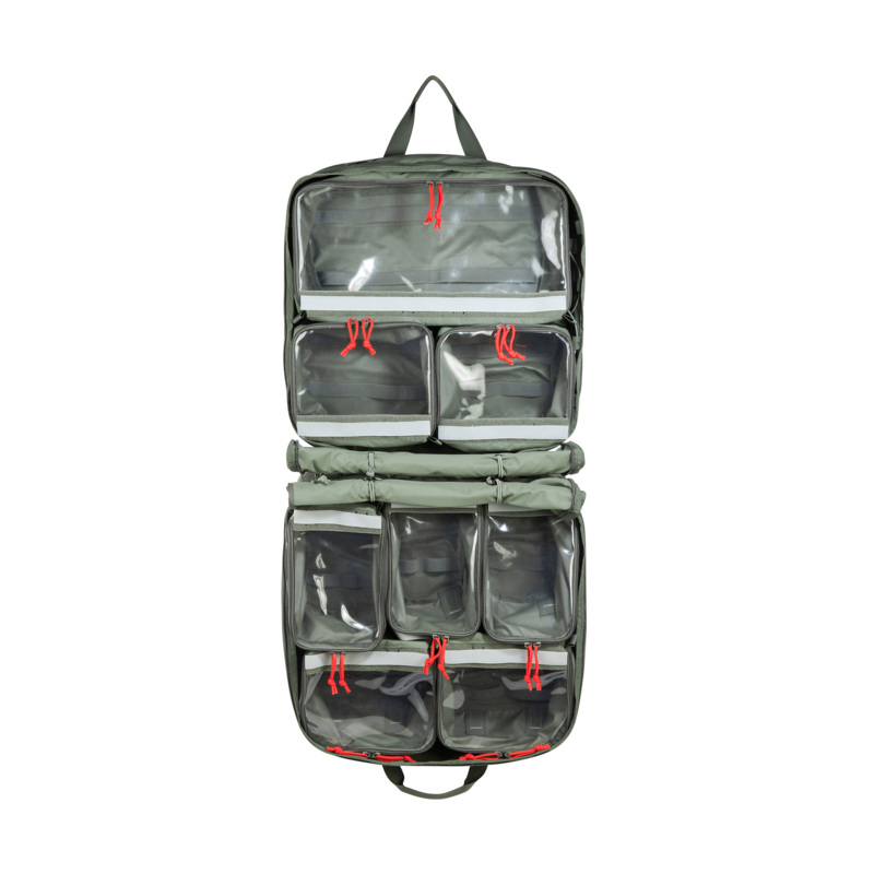 Der TT Medic Container IRR ist für die Versorgung in modularen Sanitätseinrichtungen (MSE) konzipiert. Er besteht aus zwei miteinander gekoppelten Modulen, die nebeneinander oder untereinander aufgehängt und auch um weitere Module ergänzt werden können (Verbindung mit Steckschließen). Die Module enthalten acht eingeklettete, abnehmbare und beschriftbare Klarsichttaschen in unterschiedlichen Größen. Diese sind für den Transport mit einem Staub -und Spritzschutz abgedeckt, der per Reißverschluss geschlossen wird. Stabile Bänder mit Karabinerhaken zum Aufhängen sowie ein Schultertragegurt sind im Set enthalten.