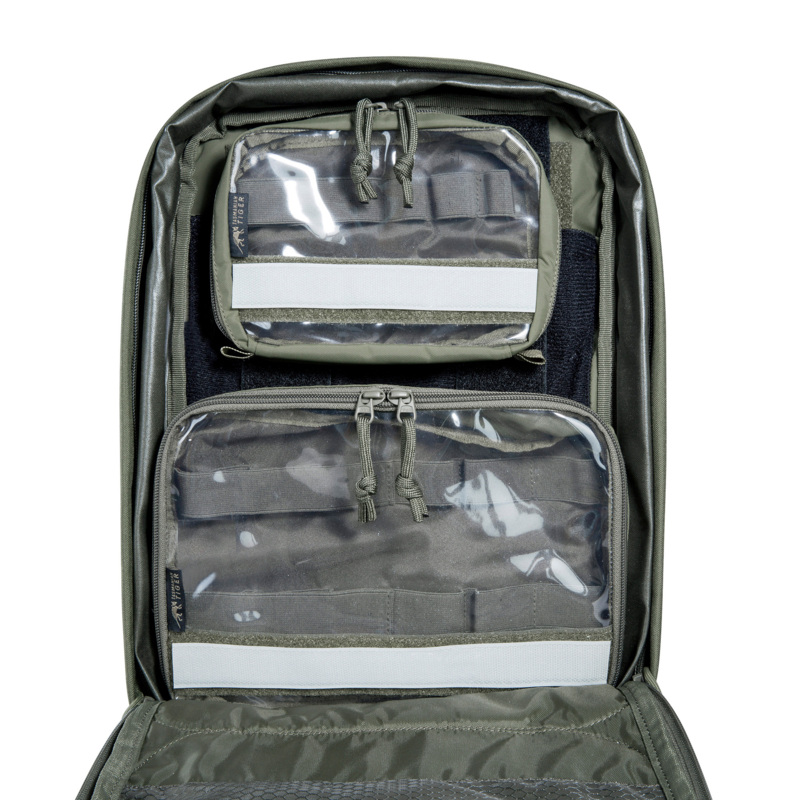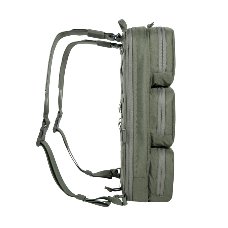 Der TT Modular Chest Rig Pack ist zur Verwendung mit dem TT Modular Chest Rig 4xM4 konzipiert. Er kann auch an Plattenträgern befestigt (Adapter im Lieferumfang enthalten) oder allein verwendet werden. Der Rucksack verfügt über ein Hauptfach, drei Fronttaschen und einen Einschub für eine Schutzplatte, das Volumen lässt sich zwischen 12 und 20 Litern variieren.