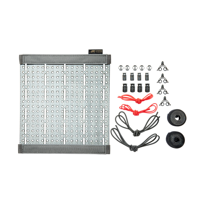 Das TT SRPP Panel mit den Maßen 23 x 25,5 cm besteht aus leichtem und stabilem Tegris®-Material (SRPP steht für Self-Reinforced Polypropylene). Das gelaserte Loch- und Schlitzmuster ermöglicht individuelle Befestigungsmöglichkeiten mit Bungee-Cord und Klettband(2 x 2 m Bungee-Cord schwarz (3,5 mm), 2 x 2 m Bungee-Cord rot (2,5 mm), 4 Squeeze Hooks, 13 Kordelstopper, 1 x 0,9 m Klettband im Lieferumfang enthalten).
