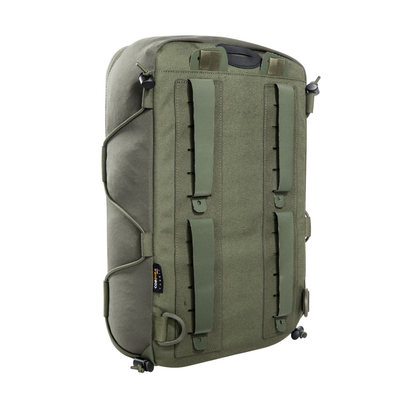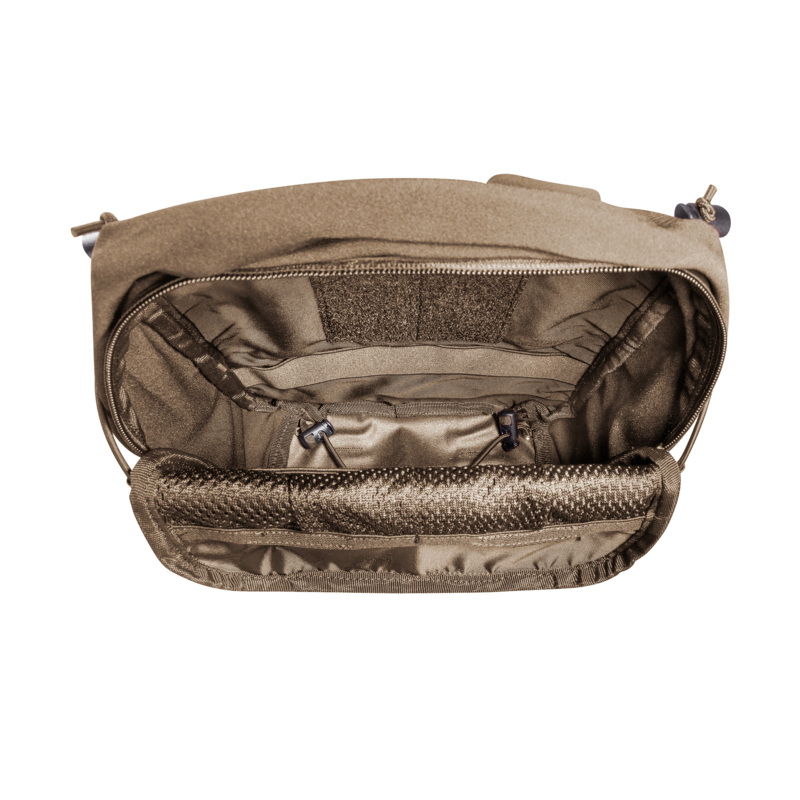 Zubehörtasche mit MOLLE-Reverse-System. Innen befindet sich MOLLE-Klett sowie eine Netztasche. Die Tasche ist zudem mit einer Trinksystemvorbereitung und dem entsprechenden Ausgang ausgestattet, und sie verfügt über eine Fronttasche mit vertikalem Reißverschluss. Die Seitenwände sind elastisch. Das gesamte System ist mit Bungee-Cord flach komprimierbar.