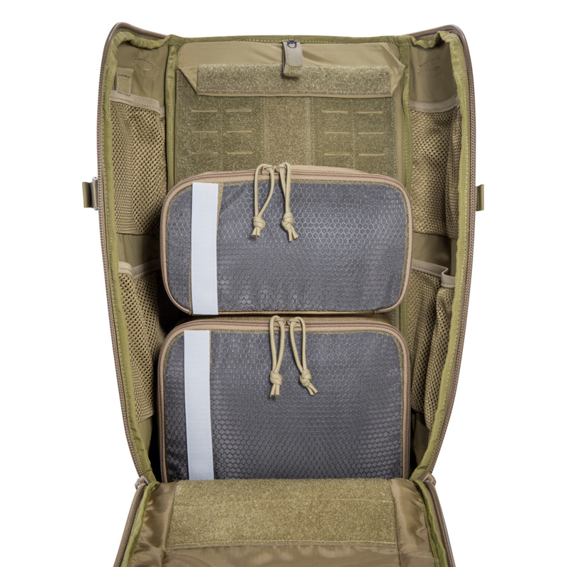 The equipment with a MOLLE hook-and-loop surface on the inside and MOLLE in laser-cut design on the outside allows for individual customization and expansion. The backpack is supplied with two hook-and-loop-fastened inner pockets. The side compression is removable and can be threaded to block the zipper.